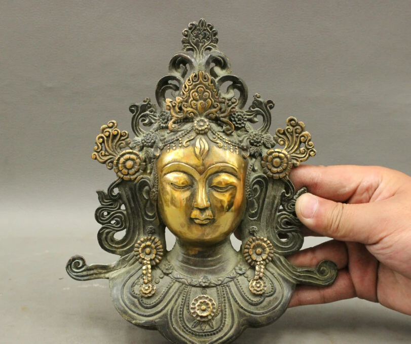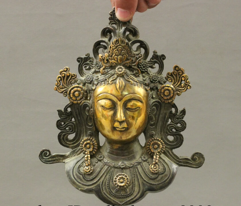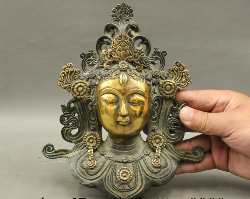 BEST QUALITY S0269 9" Tibet Buddhism Bronze Gilt Lotus 3 Eyes Tara GuanYin Head Wall Mounted Statue