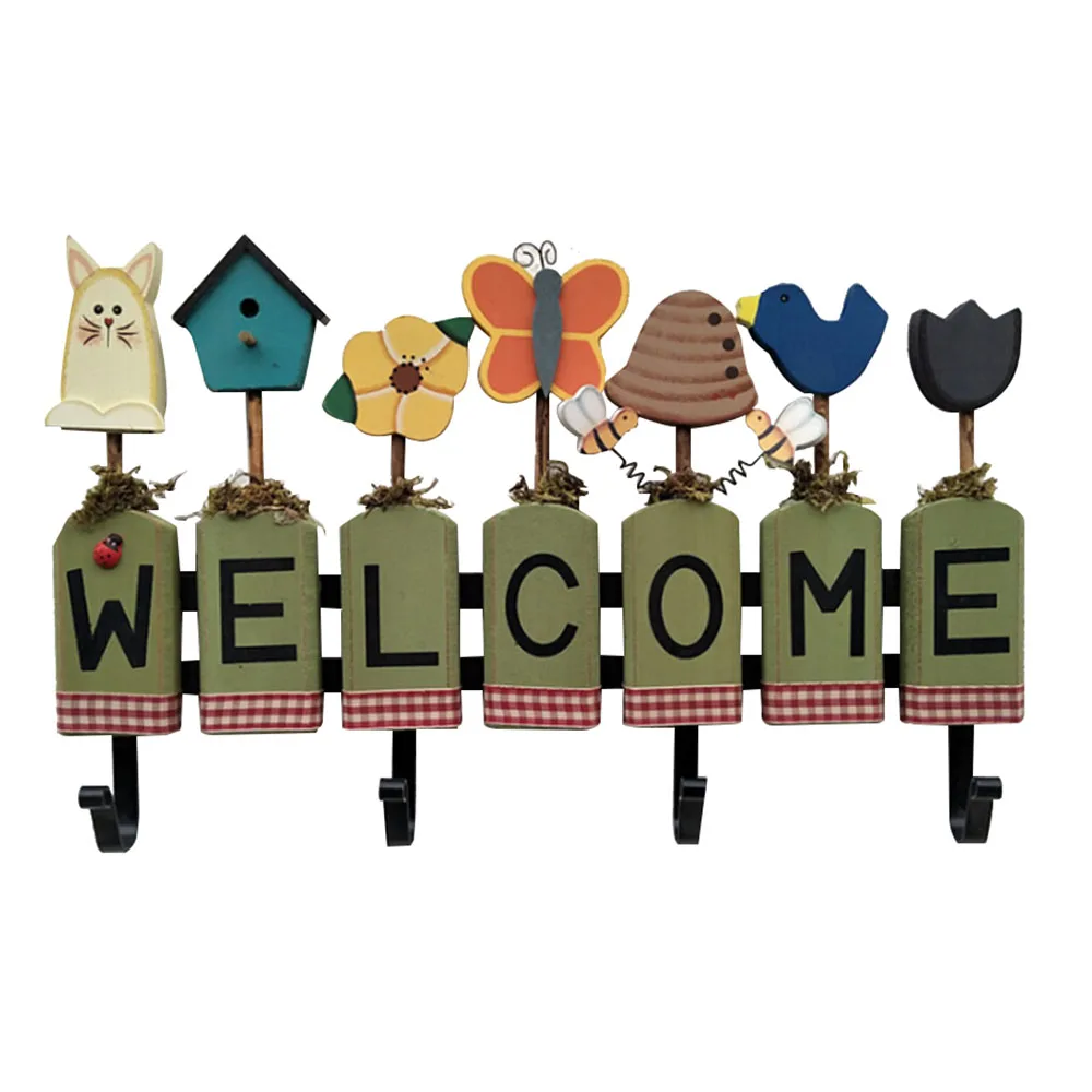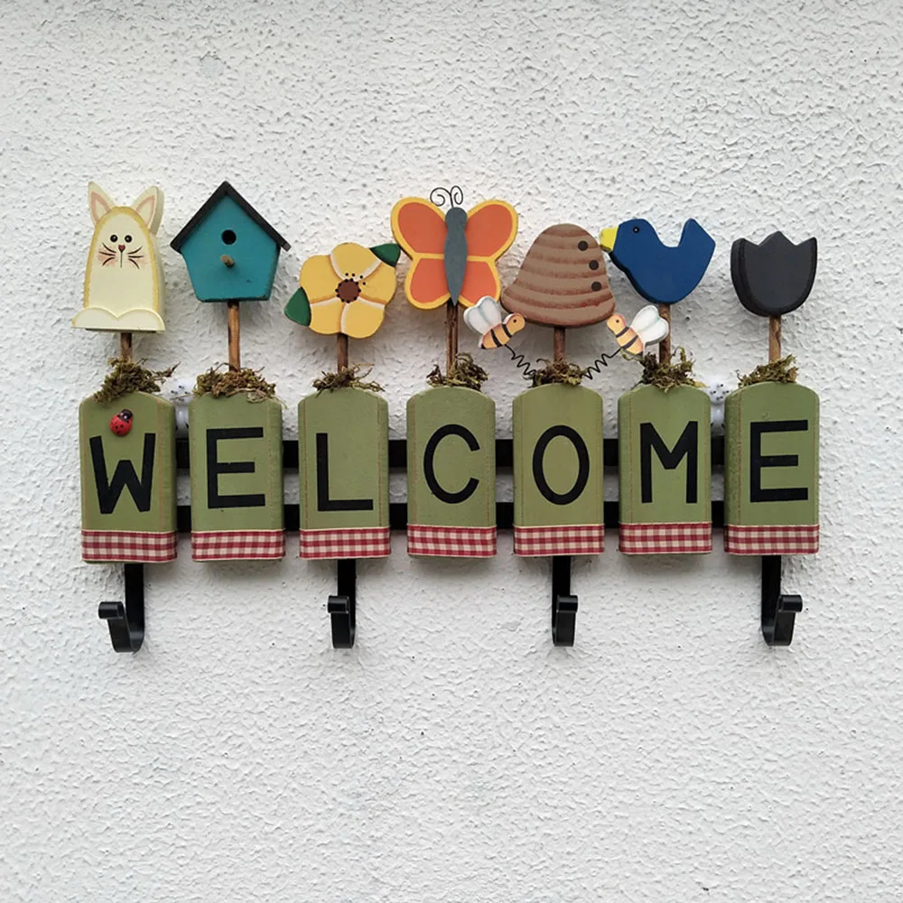 HOT SALE 1pcs Diy Decoration Hook Welcome Sign Hanger Wooden Clothes Hook Cartoon Pattren Home Wall Hanging