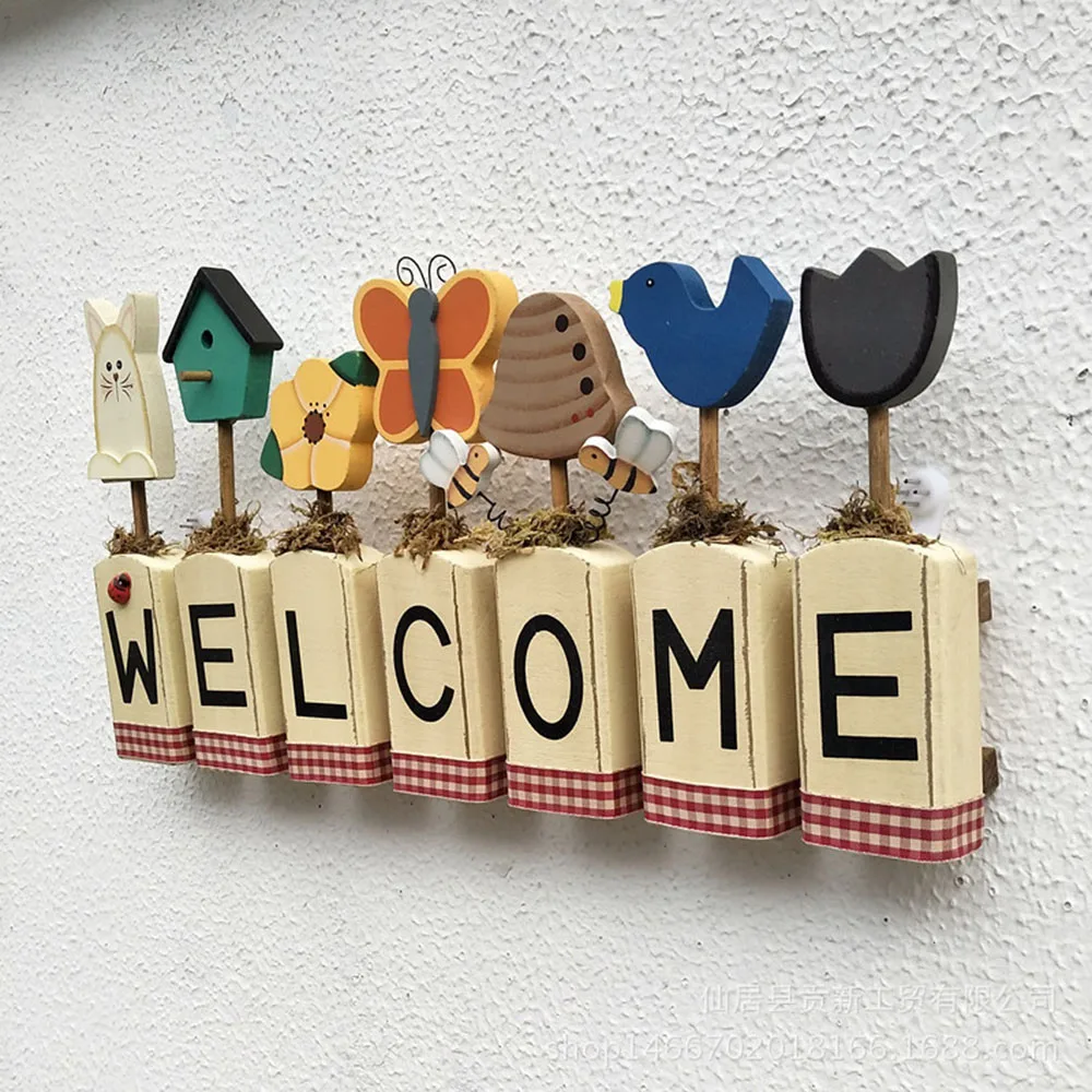 TOP 1pcs Diy Decoration Hook Welcome Sign Hanger Wooden Clothes Hook Cartoon Pattren Home Wall Hanging